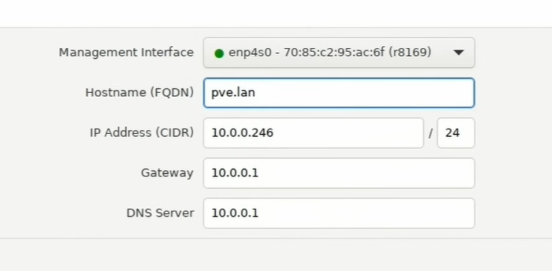 “Hostname” will default to something like “pve.home.lan” or “pve.lan”, etc. If you want to customize the name of your server, only change the “pve” part of the hostname to something else, or instead just leave it as “pve”.